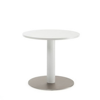 Table de réunion réglable en hauteur simple par système à crémaillère avec l'aide d'un vérin à gaz, composé d'un plateau carré ou rond en aggloméré 25 mm, contreplaqué stratifié MG Gaille 2 faces, chants bordés en matière synthétique ABS 2 mm.