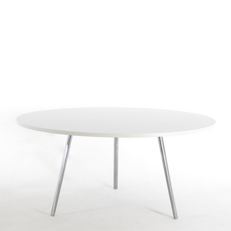 Table ronde, 3 pieds obliques très stables, plateau en aggloméré épaisseurs 25 mm, contreplaqué de stratifié selon collection MG, 2 faces, chants bordés en matière synthétique ABS 2 mm coloris assortis à la surface. 3 Pieds aluminium poli stables en position oblique, structure acier 50x40 mm en retrait. Traitement de surface aluminium, vernis époxy noir ou blanc.