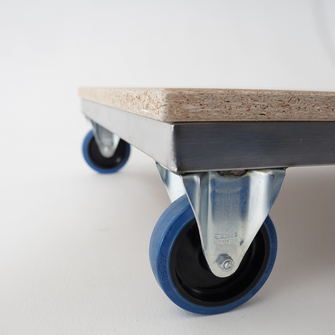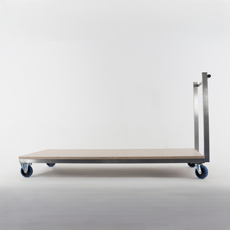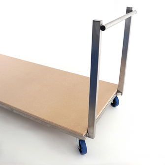 cadre avec supports métallique, en acier inox. Timon chromé, plateau aggloméré vernis incolore, roues en version standard avec 2 roulettes tournantes et 2 fixes, bandes souples pour passe-seuil, bâti des roues en acier zingué.