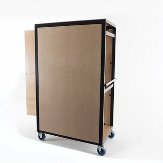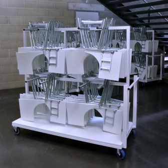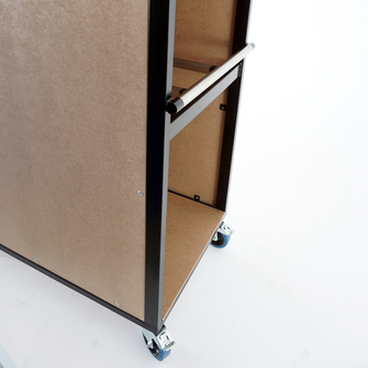 Chariot mobile pour stocker les tablettes écritoires de chaise type 109, cadre avec supports métallique, vernis époxy coloris noir. Timon chromé, 2 roulettes tournantes dont 2 avec freins, bandes souples pour passe-seuil, bâti des roues en acier zingué.