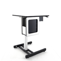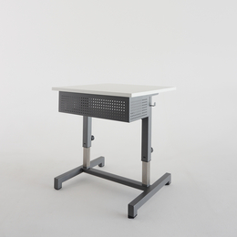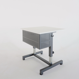 Table d'élève primaire avec grande capacité de rangement, caisson(s) avec casier(s) simple ou double, plateau rabattable, réglage en hauteur rapide par vérins et déplacement latéral aisé.
