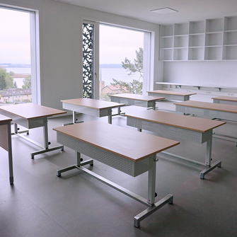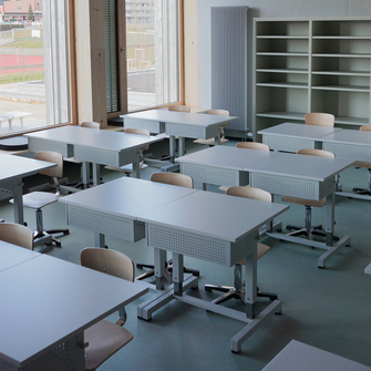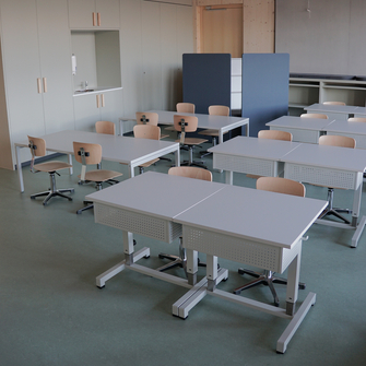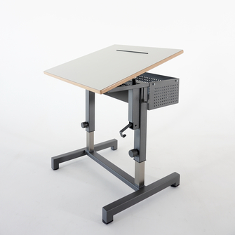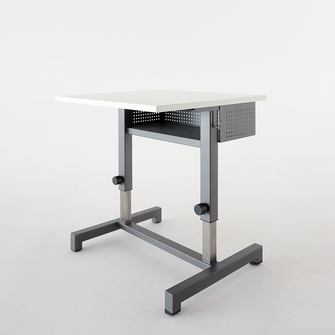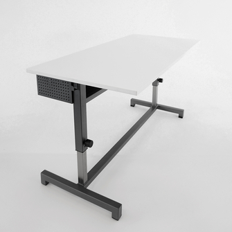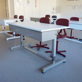 surface de travail monoplace et biplace, plateau fixe de 19 mm en 1 partie, contreplaqué de stratifié selon collection MG, chants bordés ABS de 2 mm, surface plane. Bâti et casier montés sur une structure en T renversé asymétrique, bases de 54 cm en profilé carré de 40x40 mm avec repose-pieds et 2 coulisses verticales de 50x50 mm. Système télescopique Easy-lift pour une élévation en douceur et 2 poignées de serrage pour stabiliser la hauteur. Casier simple en tôle perforée de 2 mm, hauteur disponible du casier 15 cm, séparation centrale pour la version biplace, coloris selon nuancier Ral, traitement de surface thermolaqué. Supports au sol, 2 sous-pieds latéraux réglables et 2 socles inclinés avec roulettes intégrées en matière synthétique pour le déplacement latéral.