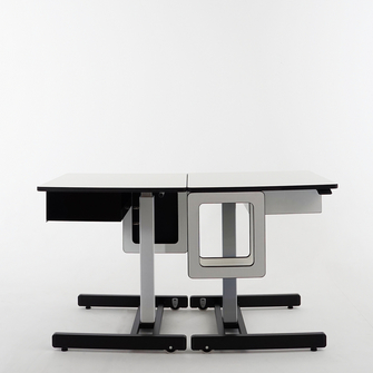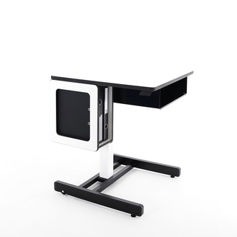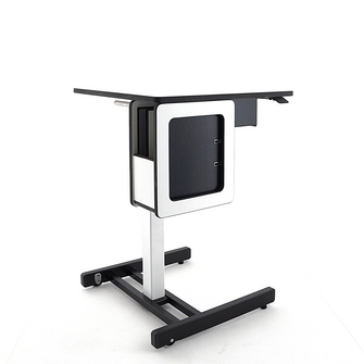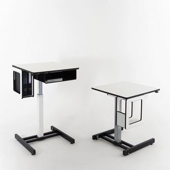 Table "assis/debout" réglable en hauteur via un système télescopique à action manuelle, rapide et fluide, sans à-coups. Équipée d'un casier de rangement au format A3 et d'un compartiment pour classeurs A4. Dotée de deux roues crantées avec freins pour un déplacement aisé et sécurisé.